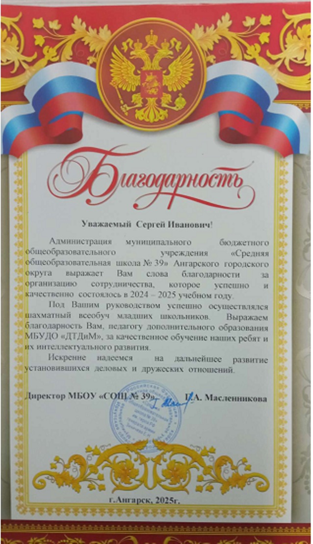 Автор ноу-хау «Чемпион города среди дошкольников за 8 месяцев!». В основе авторского ноу-хау – новейшие научные исследования нескольких групп ученых под руководством Л.С. Выготского, А.Н. Леонтьева, С.Л. Рубинштейна, П.Я. Гальперина и Я.А. Пономарева. Обучение происходит в соответствии с изложенным 2-м чемпионом мира по шахматам и доктором философии Эмануилом Ласкером принципом: «Обучение шахматам – это формирование независимого мышления. Шахматы невозможно запоминать!» То есть я обучаю детей именно думать. Это подтверждается многочисленными благодарностями от школ и Управления образования Ангарского городского округа.